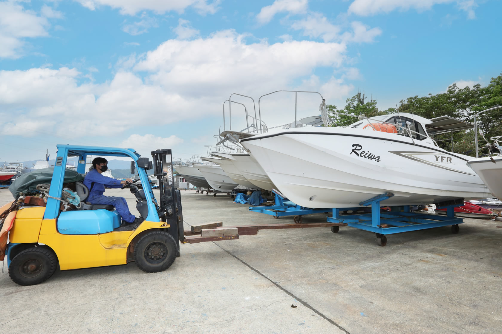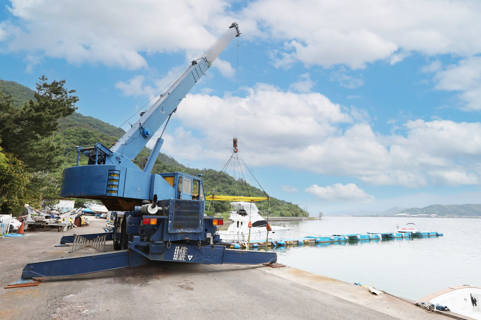 青戸マリーナでは陸上ヤードに25tラフタークレーンを完備し、お客様の大切なボートを安全に揚降させて頂いております。 海上には十分な幅と長さを確保した桟橋があり、安全な移動はもちろん、安心して離着岸を行って頂けます。 その他、クラブハウスや休憩スペースも完備しております。